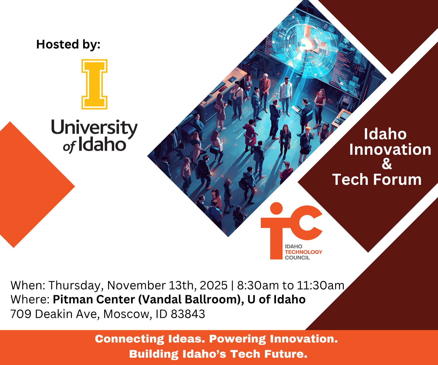 You are invited to attend the Idaho Innovation & Tech Forum in North Idaho, hosted by the University of Idaho in partnership with the Idaho Technology Council. We welcome tech professionals, tech companies, startups, investors, stakeholders, and tech enthusiasts to join the conversation around innovation and the Idaho tech ecosystem. This event is free to attend, but registration is required as seats are limited.