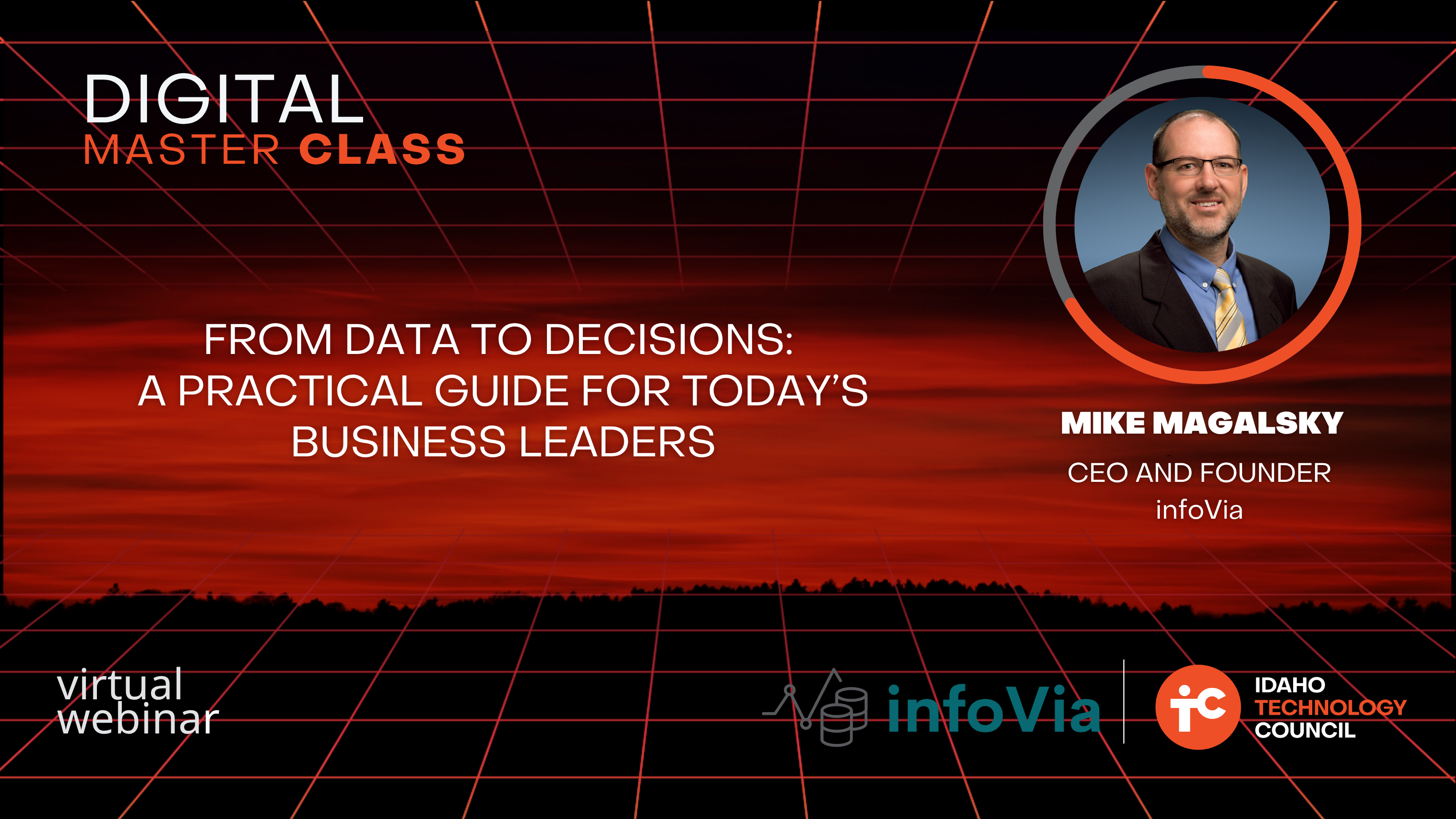 Idaho Technology Council member, Mike Magalsky, Founder of infoVIA, has partnered to provide this masterclass From Data to Decisions. It is FREE, but you must register to receive the instructions to join. It will not be recorded, but you will be able to ask questions during the class.