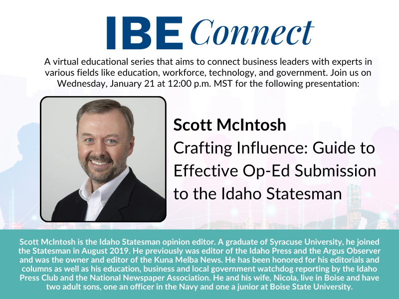 IBE Connect is an exclusive virtual educational series that aims to connect business leaders with experts in various fields like education, workforce, technology, and government. Join us on Wednesday, January 21 at 12:00 p.m. MST for a presentation from Idaho Statesman Opinion Editor, Scott McIntosh. He will be presenting on how submit effective op-eds to the Idaho Statesman.