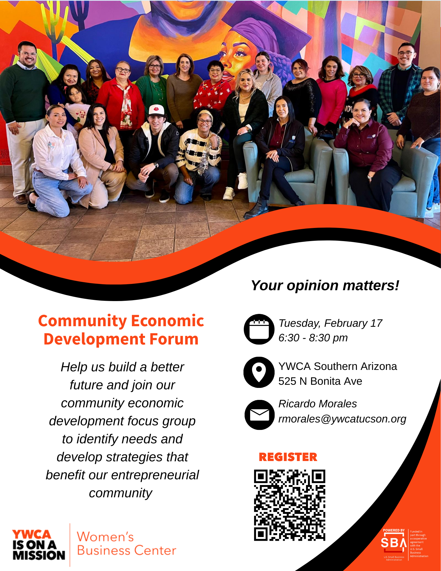 Ayúdanos a construir un mejor futuro y sé parte de nuestro grupo de enfoque de desarrollo económico comunitario para detectar necesidades y desarrollar estrategias que beneficien a nuestra comunidad emprendedora.